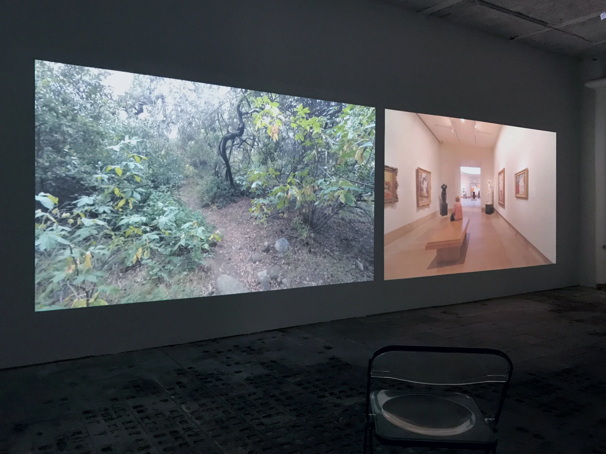At Ginerva Gambino, the projection titled “Was man nicht im Kopf hat...” stretches along the gallery's longest wall, presenting the images in near life-size. Although the two video channels have different durations, they play in a continuous loop, creating varying overlaps with each new cycle. Both videos are filmed in single takes using a GoPro camera, offering an immersive first-person perspective of the environments. The museum tour features a steady pace as the camera glides through the halls, scanning the artworks displayed on the walls. In contrast, the garden footage alternates between stillness and movement, pausing approximately every 100 seconds, creating a dynamic visual experience. While the museum's artworks represent interpretations of the world, the gardens embody a vision of nature and landscape. Interestingly, some late 19th and early 20th-century pieces from the museum depict natural scenes akin to those captured at Descanso Gardens, highlighting the interplay between artistic representation and the natural environment.
